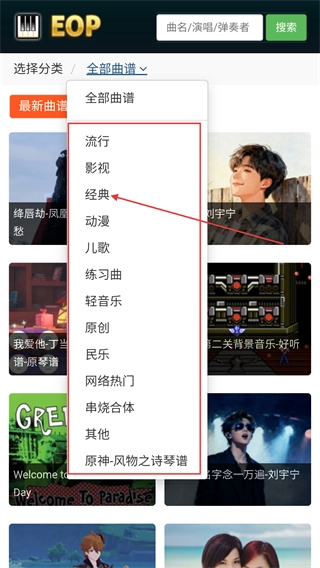 点击【全部曲谱】的下拉菜单后,会呈现出【流行】【影视】【经典】等分类选项,通过选择相应的分类,就能精准地筛选出想要的曲谱。