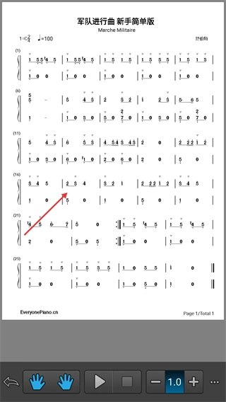 进入【军队进行曲-新手简单版】的曲谱页面,就能查看完整的乐谱内容。你可以利用页面底部的操作按钮来调整相关设置,然后就可以开始进行演奏练习了。