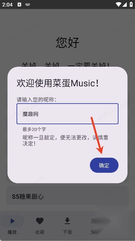 填写昵称后点击确定按钮(请注意,昵称一旦确定就不能再修改了,请您谨慎考虑后再做决定!)
