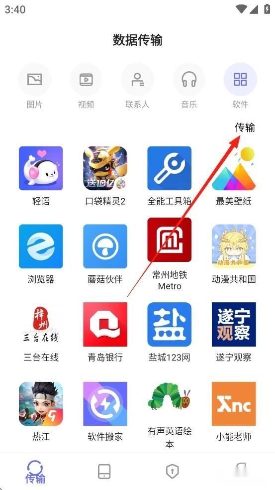 以软件传输为例,点击【软件】,然后点击【传输】