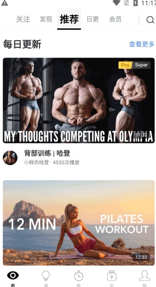 在观看的功能栏还能查看最近的健身视频。