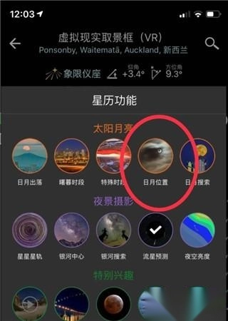 在焦距调节区域的上方,有一排彩色的方块选项,通过这些方块可以切换不同的拍摄模式或功能,在这里我们选择“日月位置”这一选项。