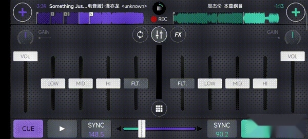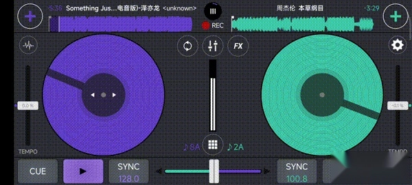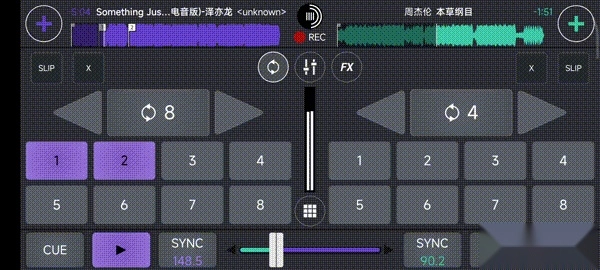 导入音频后,点击带播放键样式的播放软件就能开始打碟操作了。左侧的颜色条向上拖动可实现慢放效果,向下拖动则是倍速播放模式;cue指的是播放起始点,而中间区域用来调节左右两个音频的音量占比。
