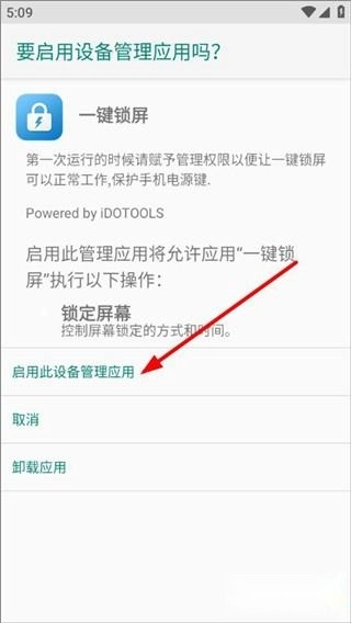 开启应用权限后打开软件,用户还需再次开启设备管理权限,若不开启则无法使用该功能,点击“启用此设备管理应用”就能完成一键锁屏的设置。