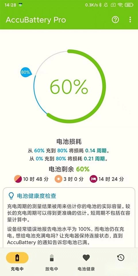 充电页面:展示电池健康计算未纳入充电周期的缘由。