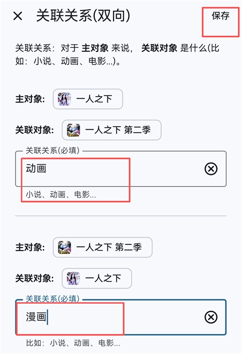 4、输入关联关系,然后点击右上角【保存】。