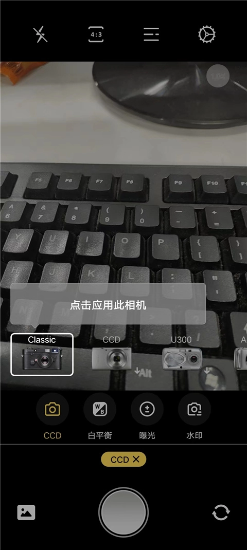 2、我们选择ccd模式,它还为我们提供了非常丰富的胶片相机,不同的相机拥有不同的滤镜,用户只需点击动检的拍摄按钮即可;