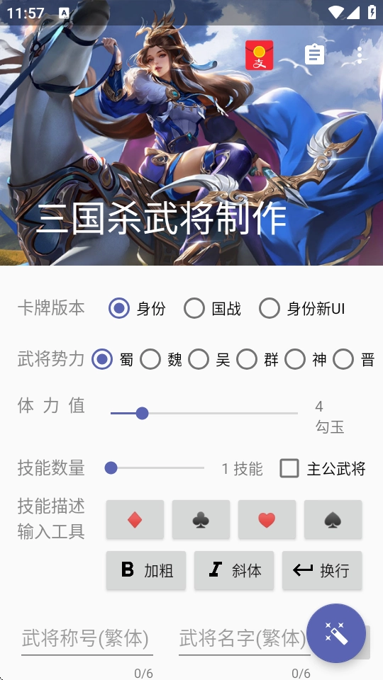 三国杀武将制作器最新版本是一款专门为三国杀爱好者打造的DIY工具,能帮助用户轻松设计出具有个人特色的三国杀武将卡牌。这款应用的界面设计简洁明了,操作起来十分直观,用户可以自由设置武将的阵营归属、头像图片、武将名称、技能效果以及卡面的整体样式。同时,它还提供了蜀吴、魏群等多种跨阵营的模板供选择,用户既可以在现有模板的基础上进行调整修改,也能够完全不依赖模板,从零开始创造出全新的武将角色。