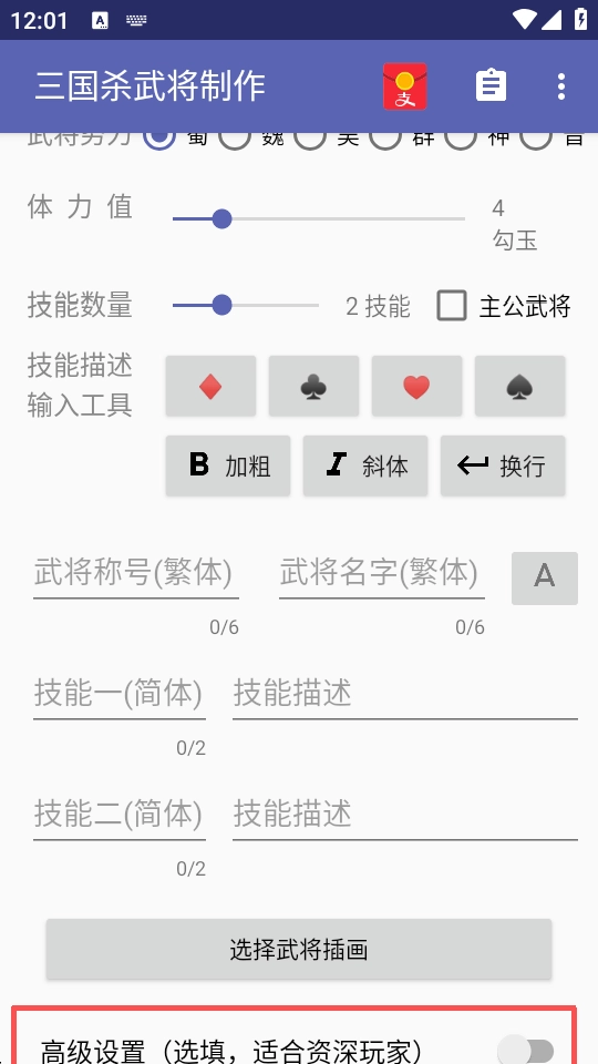 打开应用界面后会看到武将制作的基本界面