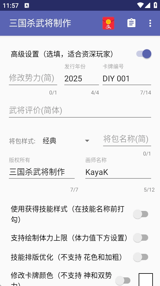 支持不同模式版本下武将卡的设计,使玩家能够依据自身喜好与需求开展创作。