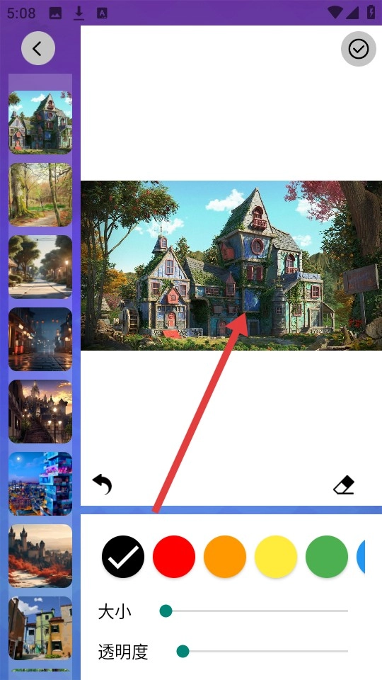 在创作页面中,选择左侧的素材以及底部的颜色、大小、透明度等参数,即可对画面开展涂鸦创作。