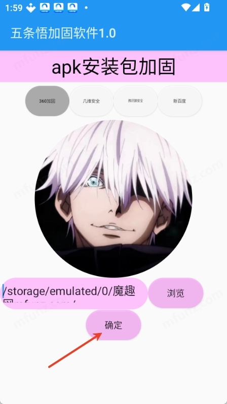 打开五条悟加固软件,接着点击浏览按钮来选定待加固的APK文件。