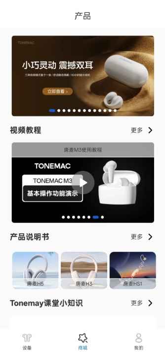 唐麦耳机安卓版贴心配备了产品说明书与视频教程,新手用户可参照详细操作指南,快速掌握耳机各项功能的使用方法。此外,它还设有专门的商城板块,支持直接选购耳机及相关配件。若有疑问,可在“我的”界面联系人工客服,获取专业解答!