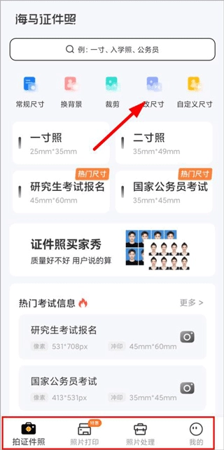 打开海马证件照后,能看到拍证件照、照片打印、照片处理以及我的这几个版块。