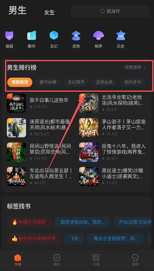 打开软件后,可先查看底部导航栏,建议重点使用“书城”和“分类”这两个入口,它们能帮助你快速知晓有哪些内容可供收听。