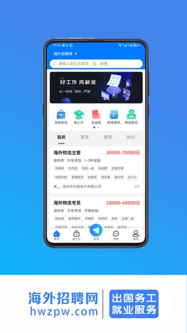 海外招聘网由陕西星枫科技有限公司开发,是一款线上招聘平台,专注于为全球华人提供最新的出国劳务信息,为外派企业与有意出国工作的人士搭建了一站式的求职外聘对接渠道。该平台的用户覆盖面十分广泛,尤其吸引了大量渴望出国工作的年轻人,他们期望通过海外工作经历拓展个人视野、提升职业技能。