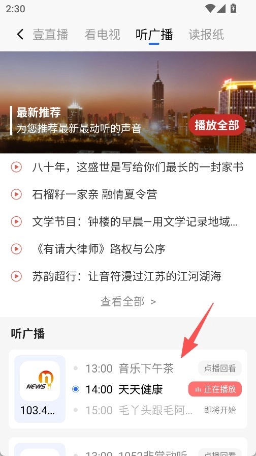 在软件里开启听广播功能,就能收听到推荐的音频内容以及实时播出的广播节目。