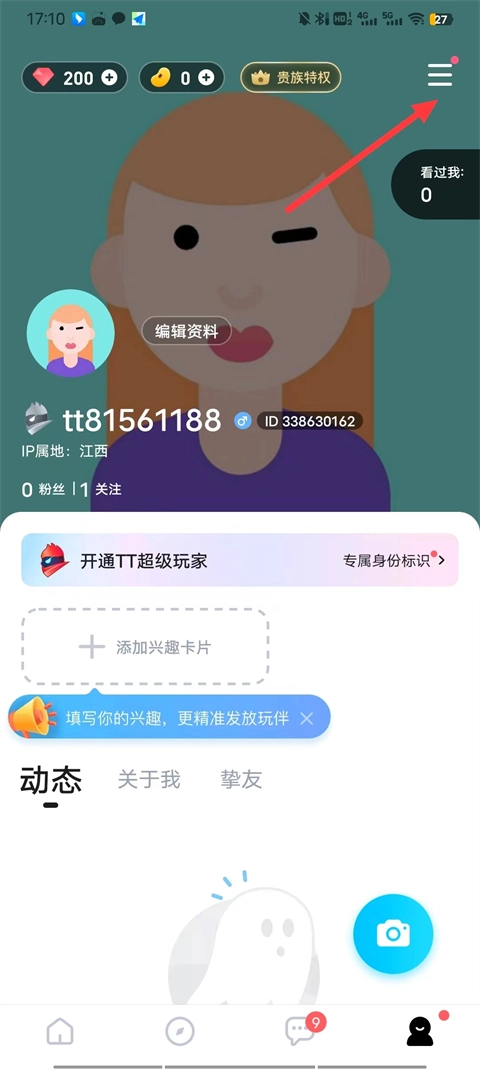 进入TT语音后,在我的界面中点击右上角的三条杠;