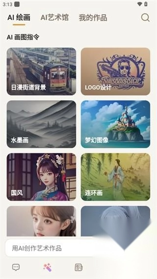 进入“AI绘画”界面后,用户可挑选各类画图指令;选定指令后,输入自身创意想法,AI便会依据这些想法展开创作。