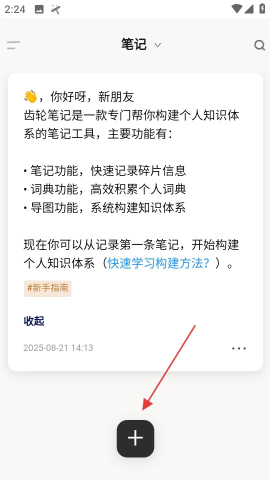 1、新手引导卡片清晰介绍笔记词典导图三大核心功能,底部加号按钮突出显示创建新内容的入口,收起按钮和时间戳保持界面整洁。