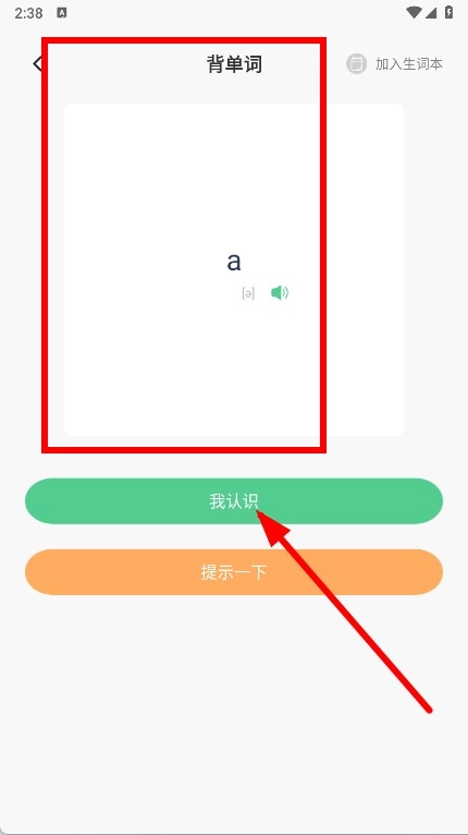 2、背单词界面会呈现单词及其发音,要是你认识这个单词,就点击“我认识”按钮。