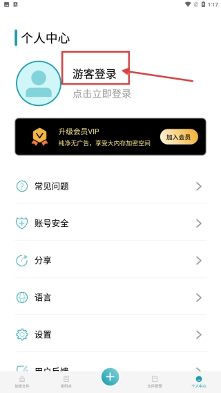 在个人中心页面,点击游客登录按钮,即可进入登录选择界面。