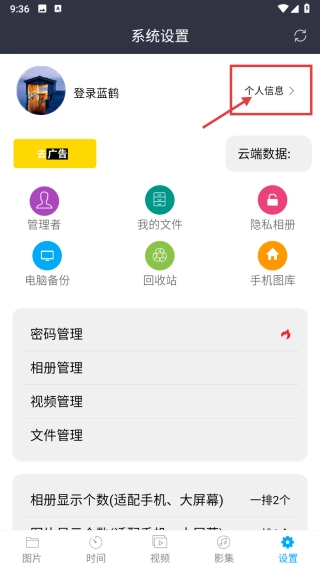 2、在系统设置页面,点击个人信息选项,进入登录蓝鹤云界面。