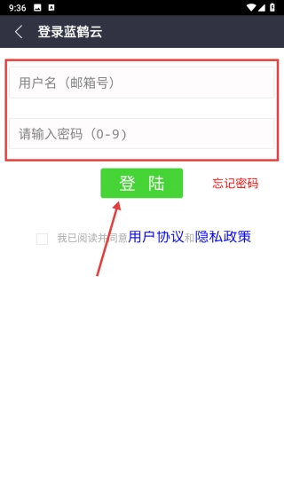 3、在登录蓝鹤云页面,选择邮箱登录方式,进入账号密码填写界面。