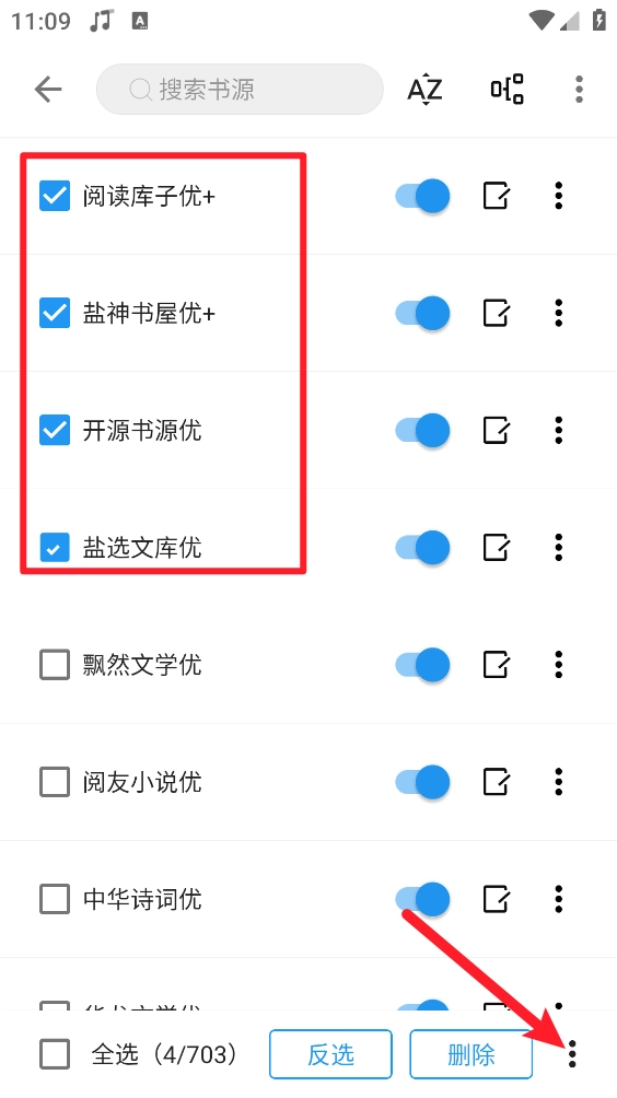 4、然后勾选所需启用的书源,点击右下角三个点。