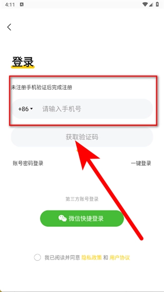 3、在登录页面,输入手机号,勾选后,点击获取验证码。
