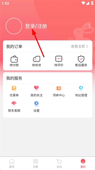 2、在个人页面,点击登录注册区域,进入登录页面。