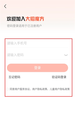 1、进入大招魔方后,点击去登录按钮,可进入账号登录页面。