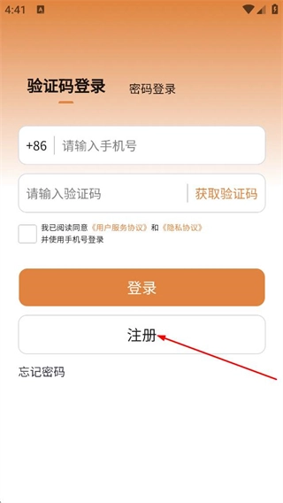 1、进入田园之家的验证码登录页面后,找到并点击注册选项,即可进入注册账号的页面。