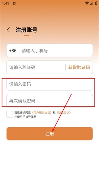 3、进入账号注册页面后,依次填写密码与确认密码,随后点击注册按钮,即可完成注册流程。