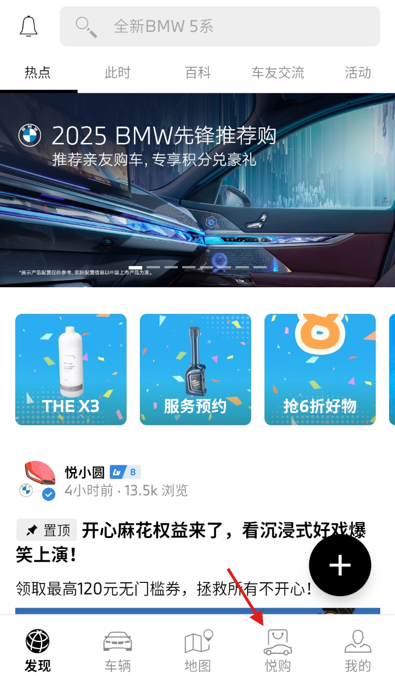 1、第一步是打开 My BMW 软件,接着在界面底部的导航栏里找到“悦购”选项并点击它。