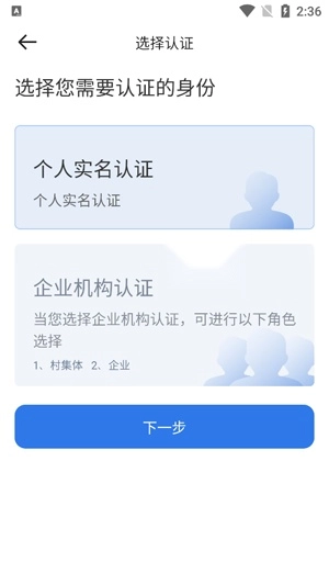 在实名认证界面选择个人或者集体认证,点击下一步。