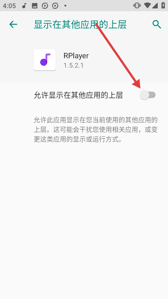 进入“显示在其他应用的上层”设置页面后,找到【允许显示在其他应用的上层】选项,点击它对应的开关按钮。
