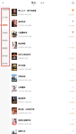 1、启动坚果小说后,在首页导航栏选择"完整榜单"栏目,这里展示各类热门小说排行。