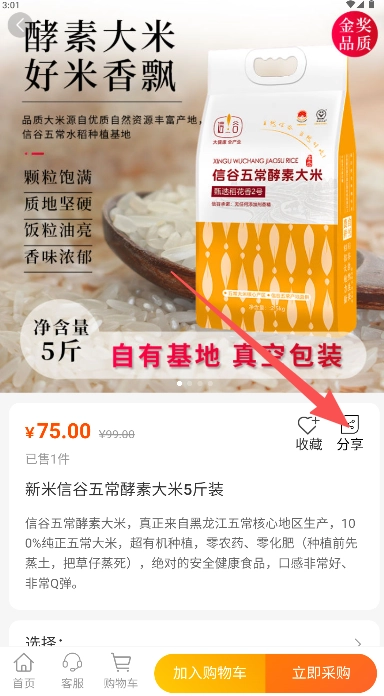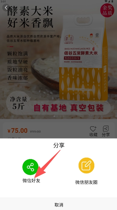 进入详情页查看商品信息使用“分享”功能。