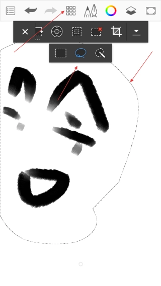 在选择界面,点击【套索工具】,在画布上【框选想要的内容】后,点击【菜单图标】。