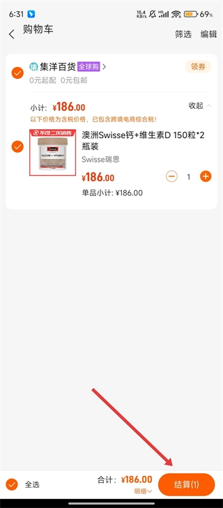 进入购物车页面,仔细核对药品信息确认无误后,点击【结算】按钮,就能顺利完成购药流程,轻松将药品带回家。