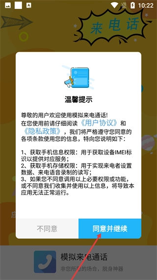 使用前请仔细阅读【用户协议】与【隐私政策】,点击【同意并继续】按钮后,即可启用模拟来电通话功能。