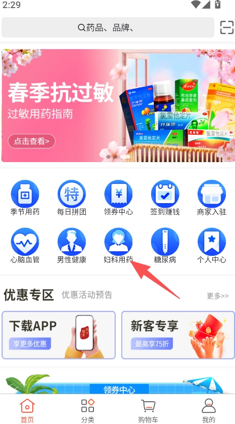 打开软件后,先选择专科分类(例如妇科用药这一类),接着就能进入药品列表页面了。