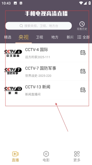 进入手机电视高清直播界面后,你可以通过【搜索频道】功能,找到并观看CCTV-4国际等央视频道的内容。