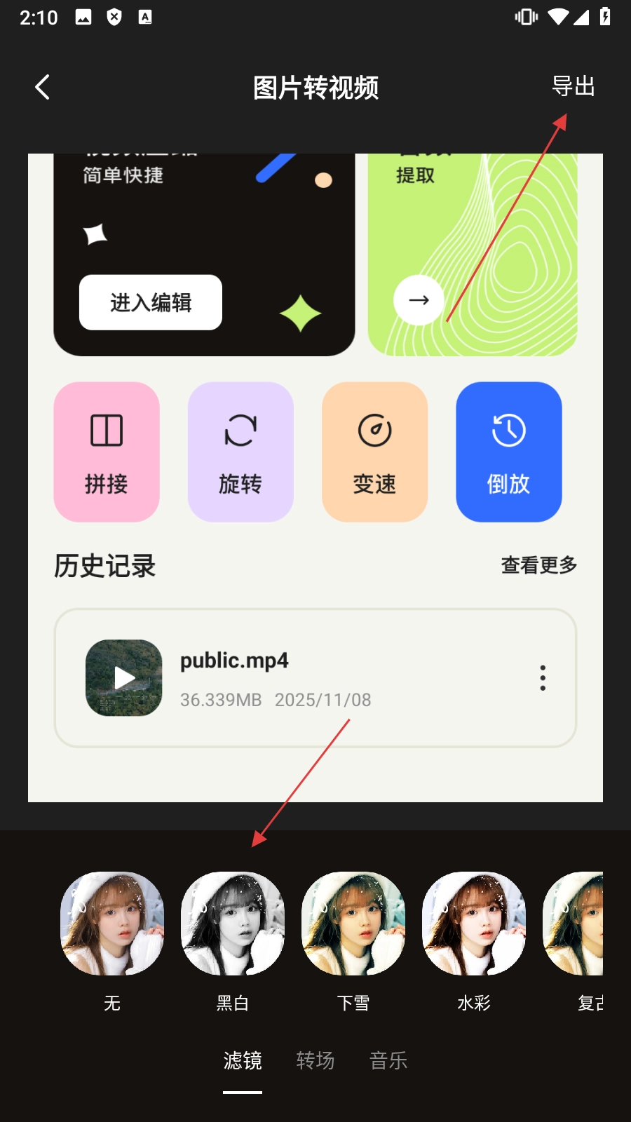 在页面里完成【设置滤镜】的操作后,点击【导出】按钮,就能结束图片转视频的流程了。