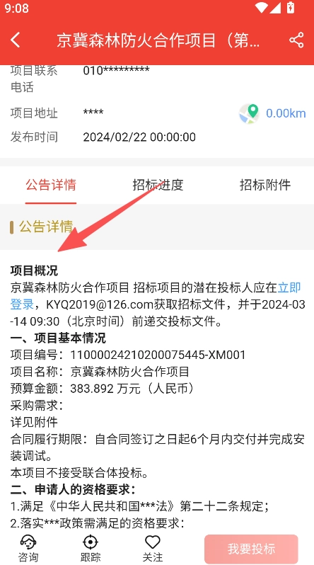 点击目标项目,查看项目的公告详情内容。