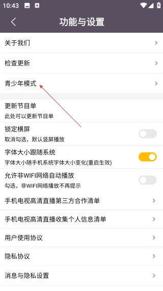 进入功能与设置页面后,找到并点击【青少年模式】选项,即可进入青少年模式的设置界面。