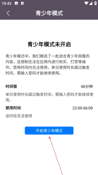 在青少年模式页面,点击【开启青少年模式】按钮,就能启用该模式所具备的内容限制功能。