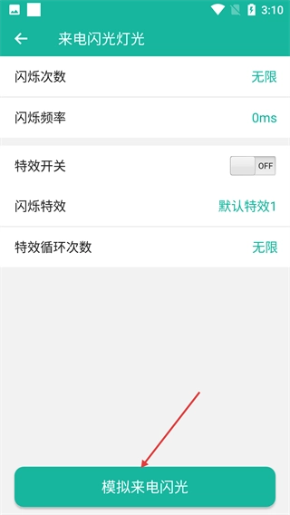 3、进入来电闪光灯光参数设置页面后,点击【模拟来电闪光】选项,以此测试来电闪光的实际效果。