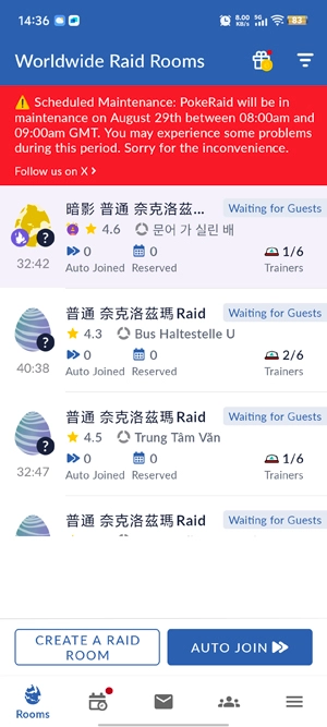 PokeRaid最新版本已成功组织超100万次突袭,将世界各地的训练师紧密相连。无论你身处何方,都能加入全球训练师发起的远程突袭。这里全天24小时都有训练师主持或参与突袭战,助你不错过任何一场传奇与超级突袭,轻松和全球玩家并肩作战。感兴趣的训练师快来加入吧!